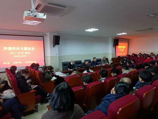 2023年2月9日-10日,经济管理学院在逸夫楼四楼多功能厅开展教职工春季思想政治素质与能力提升集中培训活动。活动邀请校党委委员、副校长李文龙为参会教职工开展师德师风主题宣讲。