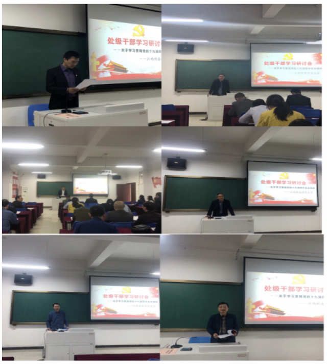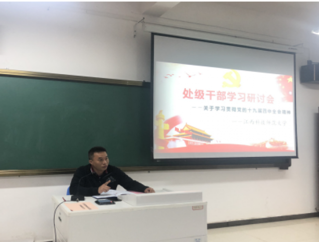 为贯彻、宣传贯彻党的十九届四中全会精神,深入学习贯彻中共中央关于坚持和完善中国特色社会主义制度、推进国家治理体系和治理能力现代化的《公报》、《决定》和习近平总书记重要讲话精神,学校处级干部培训班于2019年11月7日下午在经济管理学院党员活动室Y514组织召开了处级干部学习研讨会,主要围绕党的十九届四中全会精神、习近平总书记重要讲话精神和习近平总书记视察江西重要讲话精神,参加研讨会的同志有经济管理学院、商学院、旅游学院、美术学院、法学院、档案馆、杂志社七个部门处级以上干部。