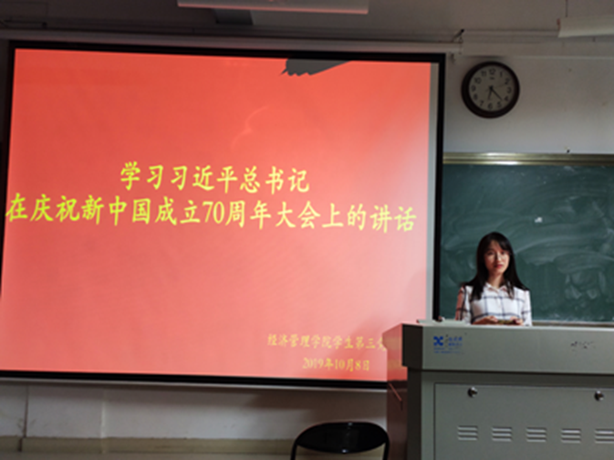 2019年10月9日晚上6:30,经济管理学院学生第三党支部在逸夫楼410举行“学习习近平总书记在庆祝新中国成立70周年大会上的讲话”主题教育集中学习会。学生第三党支部书记胡美萍老师主持,学生第三党支部全体党员同学参加学习。