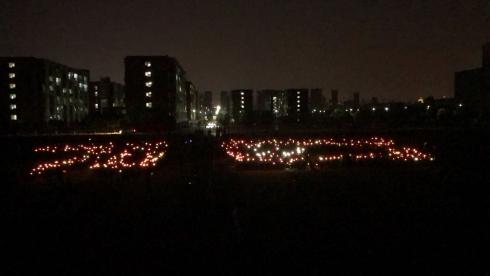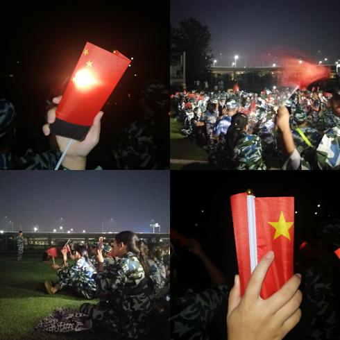在团委负责人肖瑶和团委学生会成员的指挥下,新生们有序地配合着,摆出“70”的字样和“五星红旗”的形状,寓意庆祝新中国成立70周年。摆阵完毕,天色已暗,所有人打起了灯光,束束灯光汇集成美丽的景象,点亮“70”和“五星红旗”,在黑暗中照耀夺目。随后新生伴着灯光盘坐在草坪上高声合唱《我爱你中国》、《我和我的祖国》等歌曲,点燃起同学们心中的爱国热情。