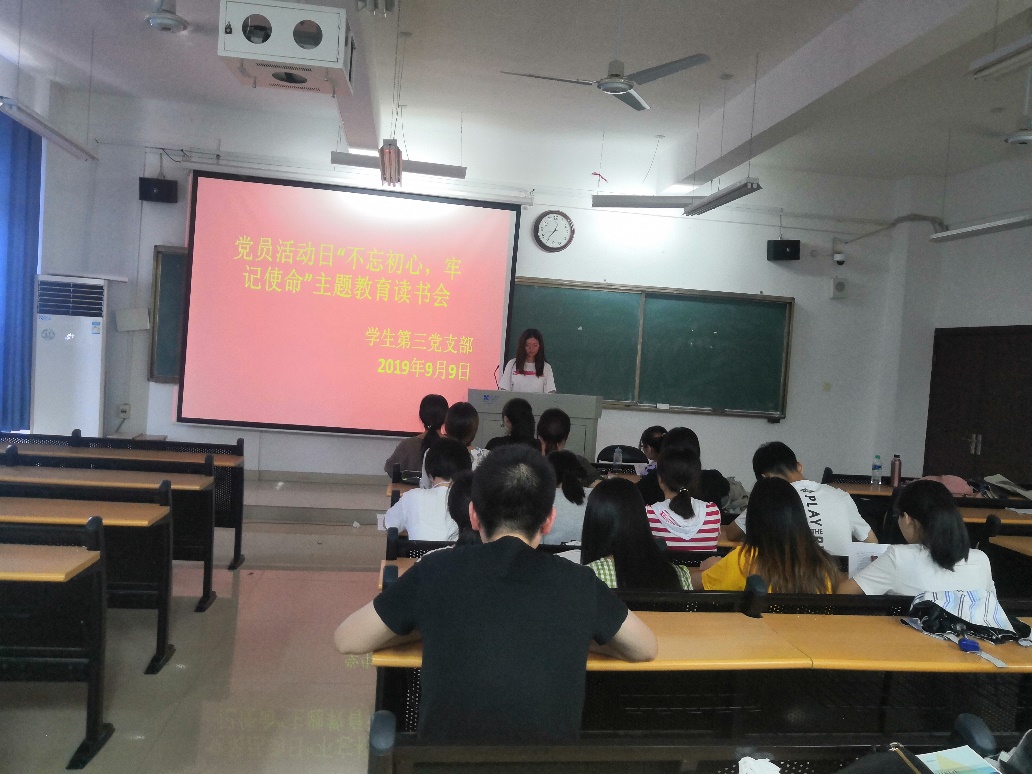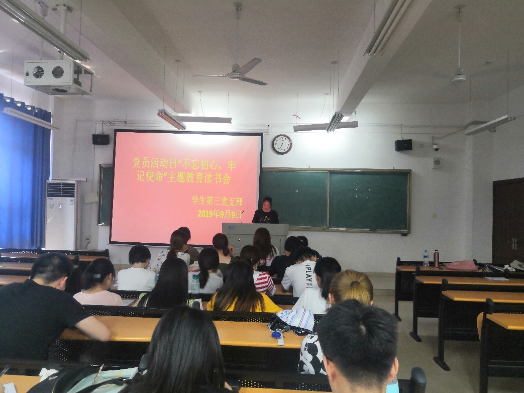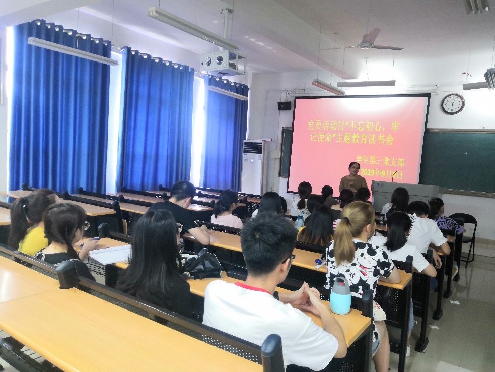 为深入贯彻“不忘初心、牢记使命”主题教育工作会议精神,促使学生党员进一步坚定理想信念,更加自觉地为新时代党的历史使命而努力奋斗,9月9日上午,经济管理学院学生第三党支部在逸夫楼Y410开展了九月份党日活动“不忘初心、牢记使命”主题教育读书会。