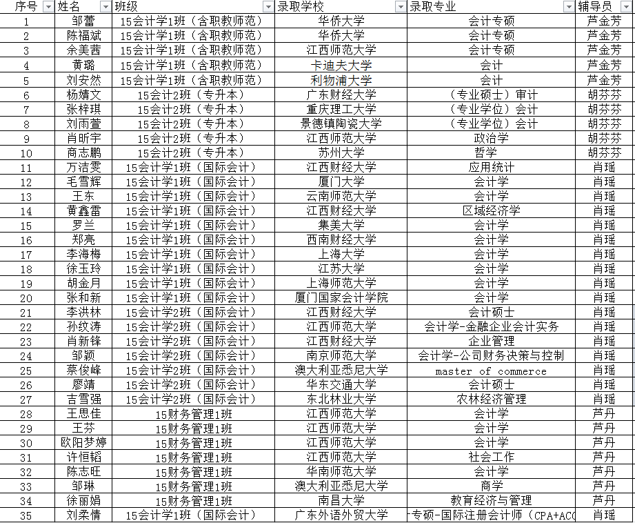 2019年,经管学院应届毕业生邹蕾等35名同学经过不懈的努力,考取了心中理想的学府。在此,学院向同学们表示衷心祝贺!希望你们能不断进步,永远牢记“明德敬业”的校训,不怕困难,不断前行,母校永远是你们坚强的后盾。