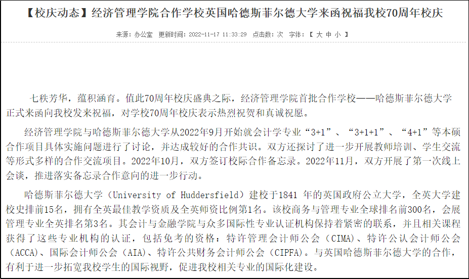 五年来,学院党委围绕开放办学,不断加强统筹谋划,创新工作举措,以构建高层次合作平台为引领,以开展高水平交流合作为纽带,在学校国际合作与交流处指导下,着力搭建与国际大学合作网络,不断拓展合作空间,推动学生境外培养和交流,大力引进国际高水平智力资源,深化务实合作,推动学院对外合作交流与开放办学事业的发展。2022年10月,学院与建校于1841年的英国政府公立大学哈德斯菲尔德大学正式签订校际合作备忘录,在教师培训、“3+1”、“3+1+1”、“4+1”等本硕合作项目达成较好合作共识,为学院国际化办学再开新局。