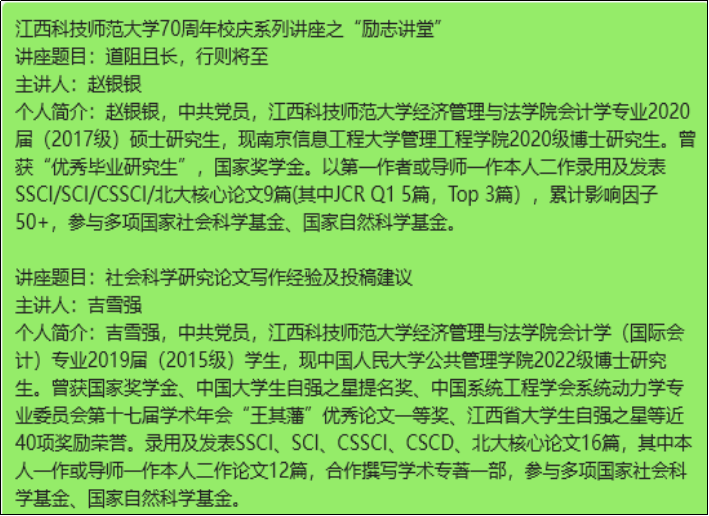 五年来,学院党委牢记立德树人根本任务,坚持以学生为中心,以促进学生综合素质全面发展为目标,不断探索学生工作新理念、新思路、新举措,积极适应新时代高校学生工作新要求,努力满足学生成长成才新需要,以扎实行动和工作成效,助力学院内涵式高质量发展。2018-2023年间,学院先后培养出了“中国大学生自强之星”提名奖获得者、“江西省大学生自强之星”“中国人民大学公共管理学院2022级博士研究生”吉雪强、校“优秀毕业研究生”“南京信息工程大学管理工程学院2020级博士研究生”赵银根、“中国大学生自强之星”“江西省优秀共青团员”易晋凡等众多优秀学生,激励了一代又一代经法学子再接再厉,再创辉煌。