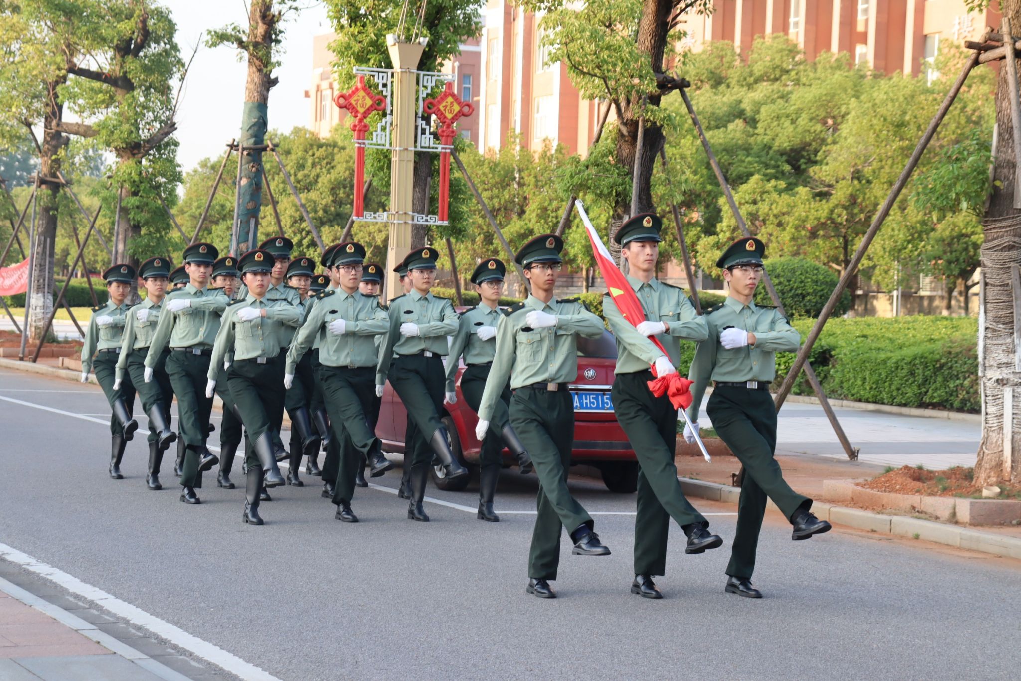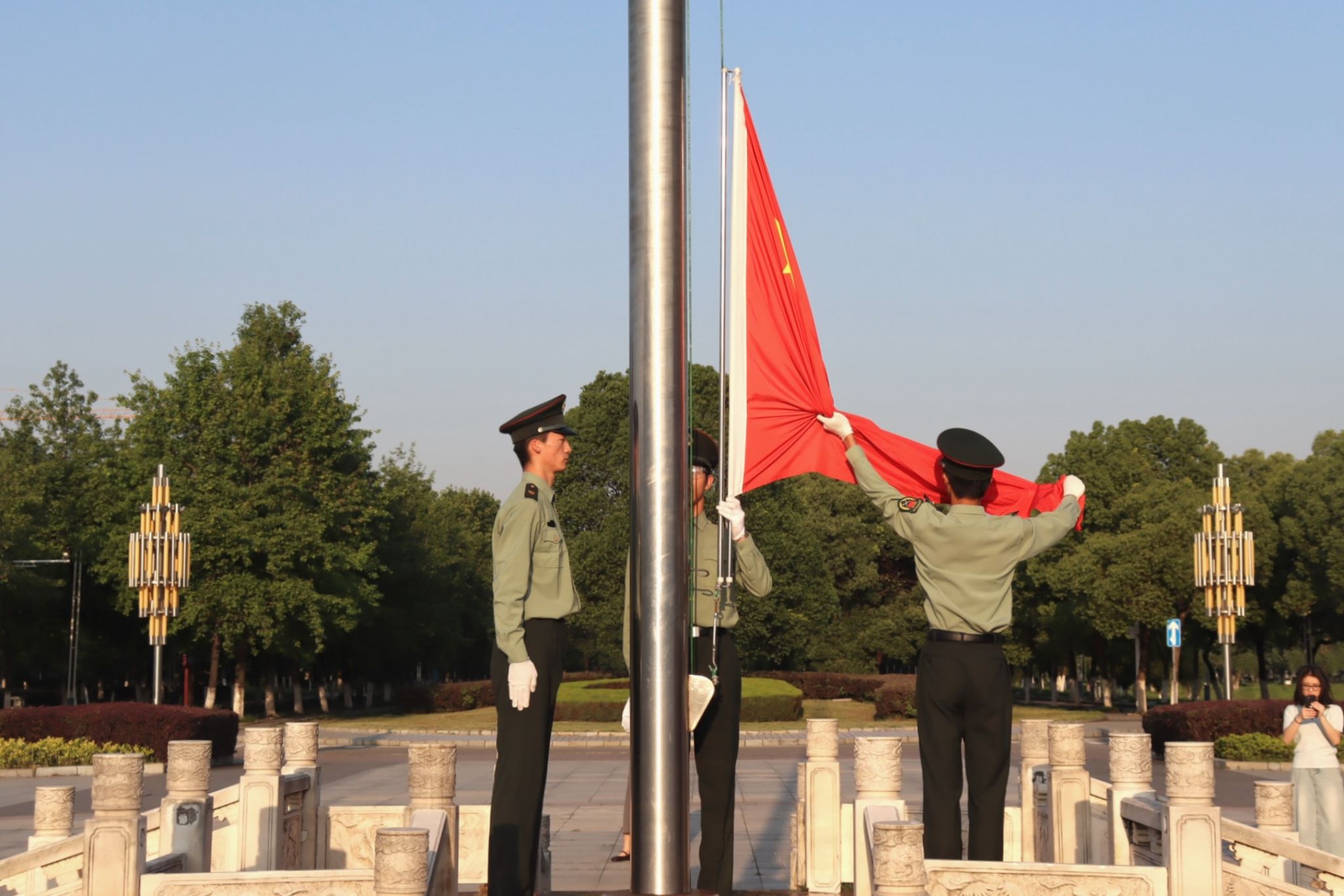 晨光中,国旗护卫队迈着矫健整齐的步伐踏入广场,全场肃立,氛围庄重而肃穆。