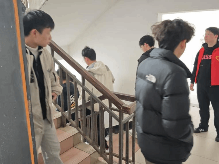 演练正式开始时,校园的警报声骤然响起。各楼层待命的经法自律委成员及学生党员迅速响应,即刻投身到工作当中。他们沿着走廊逐间敲响宿舍的大门,力求每一位同学都能及时接收到消防疏散演练的信息,确保消防疏散工作的落实。