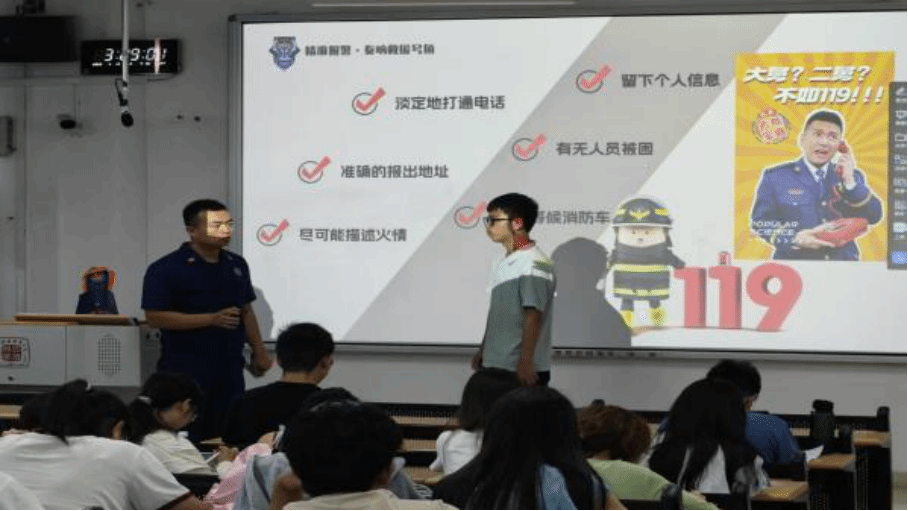 在培训活动中,消防员教官凭借其丰富的实践经验和专业知识,运用图文并茂的演示文稿、生动的案例视频以及现场实操等多种形式进行讲解。在报警知识讲解部分,教官教导同学们遇到火灾时要保持冷静,按照“淡定地打通电话、准确地报出地址、尽可能描述火情、留下个人信息、有无人员被困、路口等候消防车”的步骤正确拨打119报警电话,确保消防救援力量能够快速、准确地到达火灾现场。