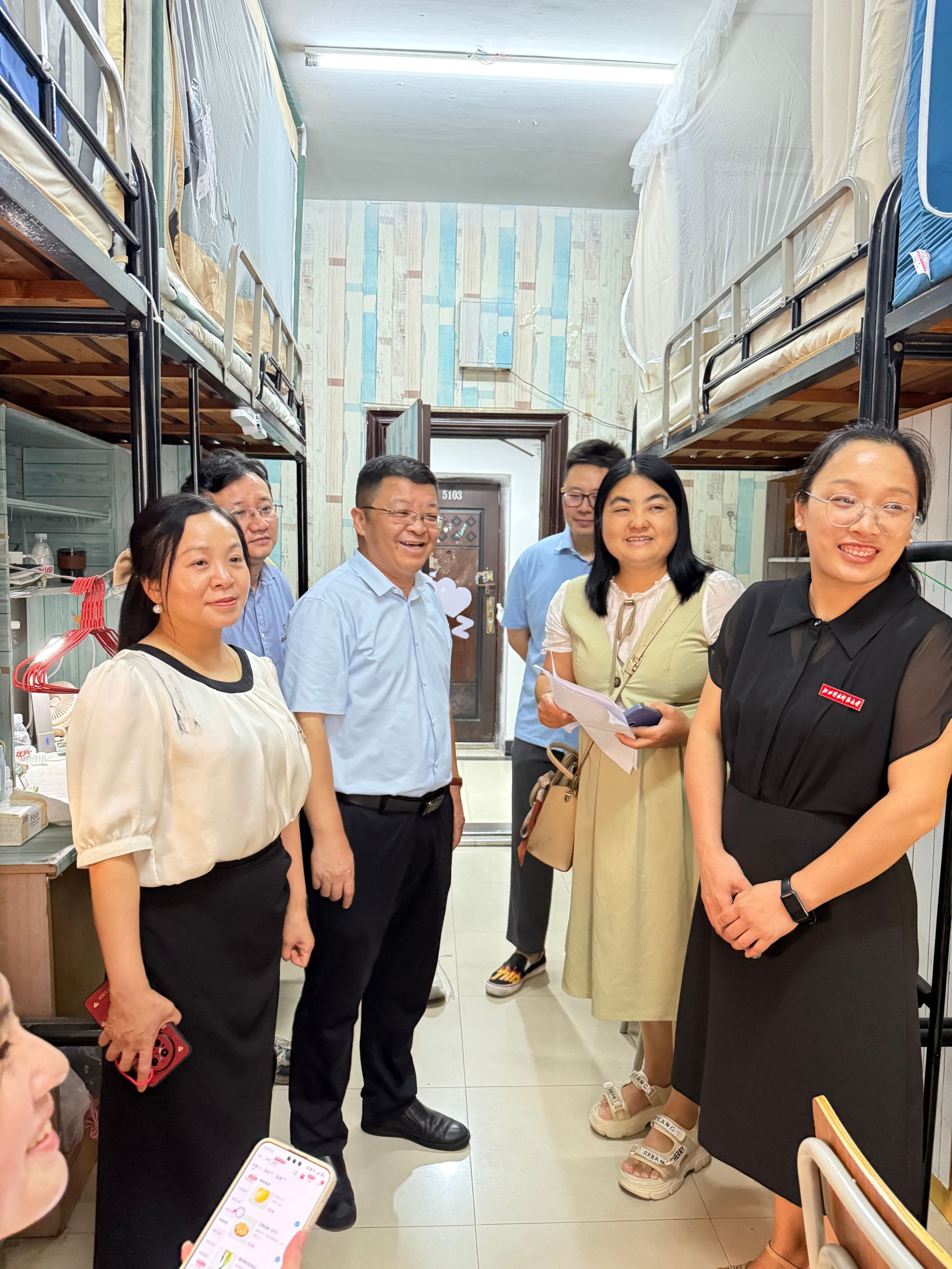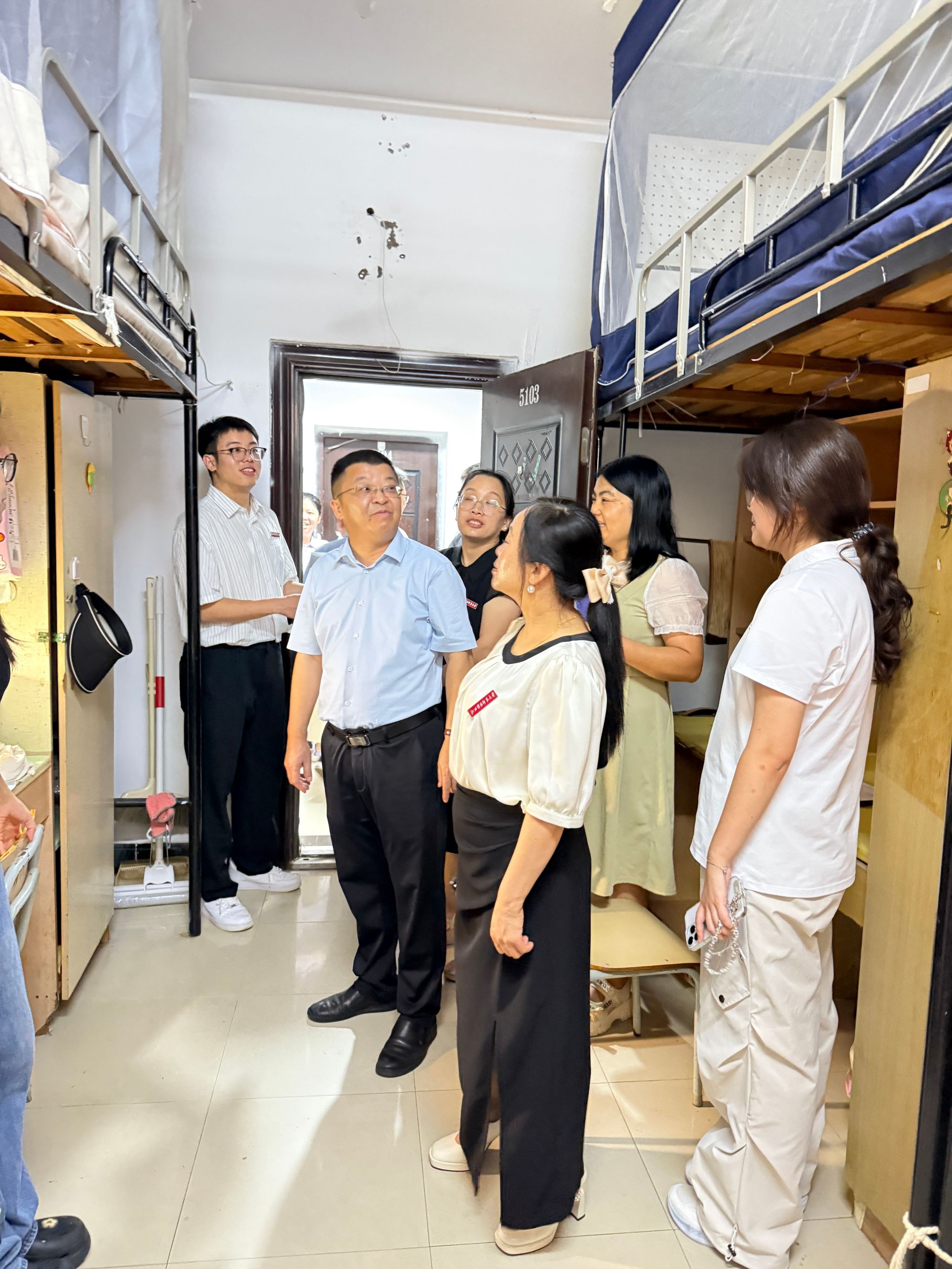 走访过程中,学院领导与老师们细致查看寝室卫生、安全设施和生活条件,了解学生入学以来的适应状况——从宿舍与校园环境是否满意,到日常生活中有无具体困难。同时,学院领导也耐心解答同学们提出的各类问题,并鼓励大家主动适应新环境,以积极向上的面貌迎接大学新阶段。辅导员们则送上贴心提醒,希望同学们从独立生活开始,学会与室友和睦相处,养成自律习惯,同时牢记学习是根本,为大学新征程扬帆起航。