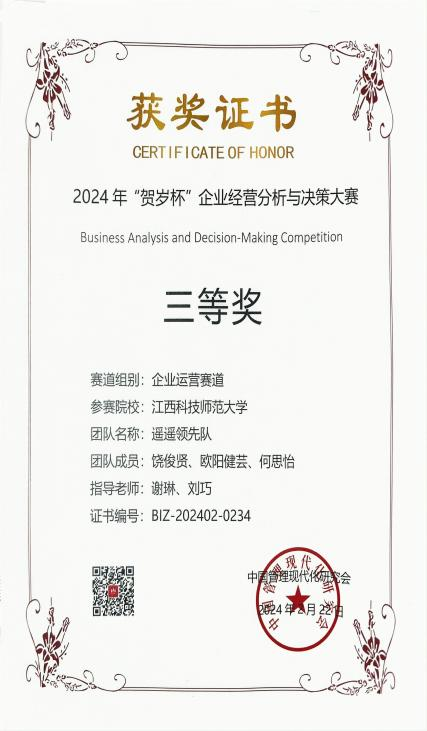 在学术竞赛和创新创业活动中,饶俊贤同样表现出色。在全国高校商业精英挑战赛国际贸易竞赛“颜值立方杯”跨境电商赛道全国总决赛中,他凭借出色的表现荣获二等奖;在全国高校商业精英挑战赛会展专业创新创业实践竞赛酒店调研报告组全国总决赛中,他荣获三等奖;在“贺岁杯”企业经营分析与决策大赛中,他荣获国家三等奖。这些成绩的取得,不仅彰显了他在学术和创新领域的卓越能力,也为学校赢得了荣誉。