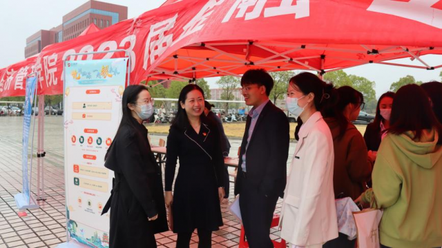 为促进我院广大青年踔厉奋发,勇毅前行,引导学生将个人发展与国家战略需求紧密结合,切实做好我院毕业生就业服务工作,实现高质量就业。经济管理学院于2022年10月27日上午9:30在学校第一食堂广场举办经济管理学院2023届金融专场招聘会,经济管理学院院长罗焰、副书记万康、副院长刘斌与就业专干宋琳芳,以及南昌市政府金融办党组成员、副主任秦娟(99级会计学校友)莅临现场指导工作。