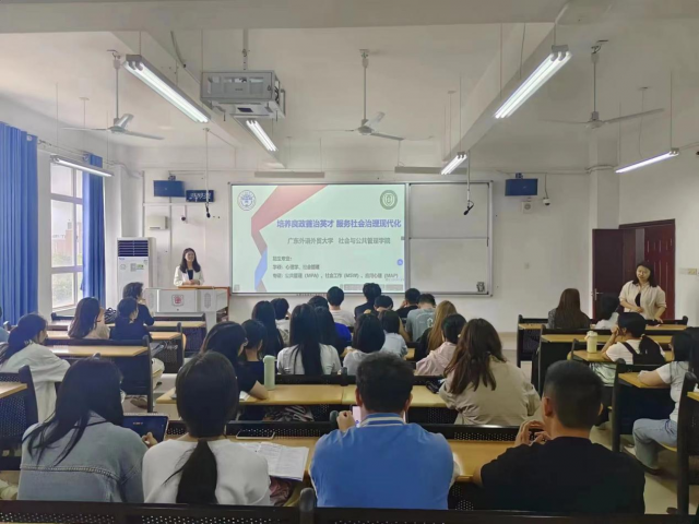 为深入推进两校交流合作,同时也为我院有意向报考广东外语外贸大学研究生的同学提供一次了解目标院校的机会,广东外语外贸大学研究生招生团队联合我院于4月26日11点在逸夫楼y210开展了一场研究生招生宣传讲座。