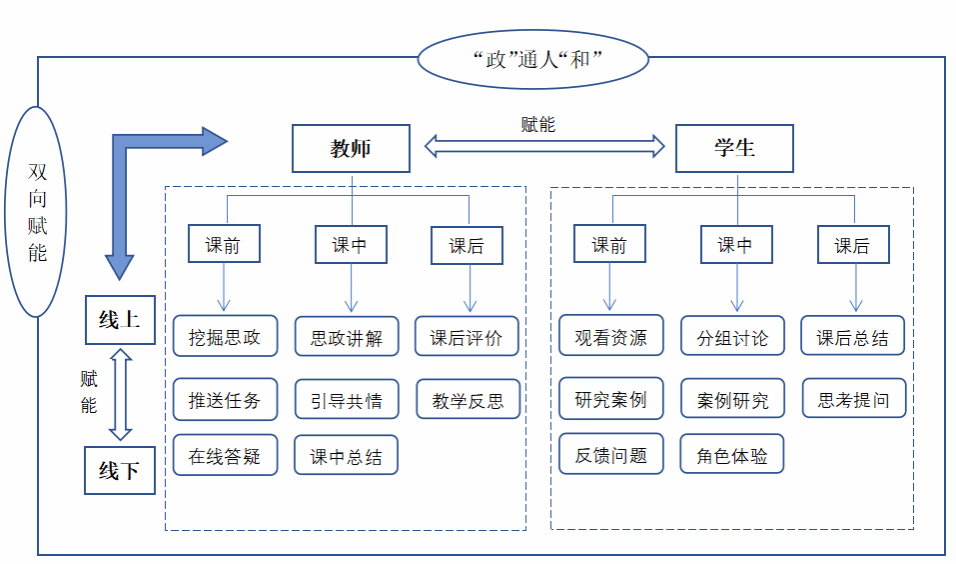 围绕课程思政的培养目标及学习者特征分析,合理构建线上线下双向赋能混合式教学模式:(1)搭建“线上”教学平台。利用MOOC、云班课等数字资源,拓展教学方式导入思政元素,如“学生提前看材料——思考老师留下的问题”;(2)利用“线下”智慧课堂促进思政元素内化。通过雨课堂、云班课等智慧教室,对学生进行思政元素的阐述、解释和丰富。(3)促进双向赋能,达到“政通人和”。双向赋能:一是线上与线下赋能,二是学生与教师赋能,在教学中给学生带去真切的角色体验感。双向赋能模式能将教学转变为师生探讨模式、情感体验模式。