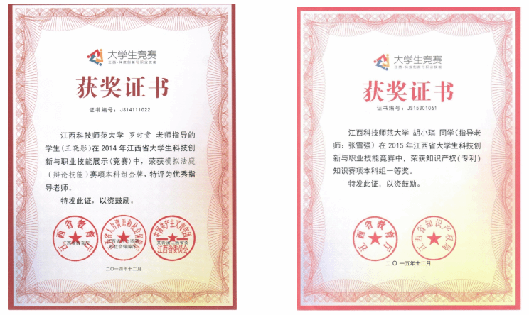 图17 2014江西省大学生“模拟法庭”本科组金奖 图18 2015江西省大学生“知识产权知识赛” 本科组一等奖