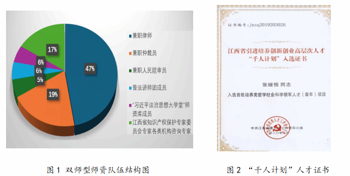 1.具有较强实力的双师型师资队伍。本专业现有教师27人,高级职称占比51.8%。博士占比44%。江西省“双千计划——哲学社会科学领军人才(青年)”1人,“江西省‘八五’普法讲师团”成员2人;江西省“习近平法治思想大学堂”师资库成员3人。专业“双师型”教师21人,占比达70%以上。其中,兼职律师17人,兼职仲裁员7人,兼职人民陪审员2人,江西省知识产权保护专家委员会专家各类机构咨询专家6人。