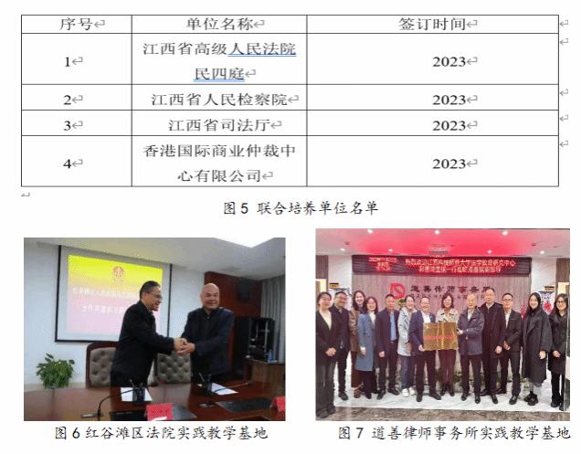 3.院所联合培养人才机制日趋成熟。学院与4家单位签订了联合培养协议,在18所法律业务单位建立实践教学基地。以4个联合培养协议为基础,探索打造法治人才院所联合培养机制。其中3个省内联合培养基地以培养国内高素质法治人才为主要目标,狠抓涉外国际仲裁法治协同培养基地战略合作纲要的落地施行,成为培养具有涉外法治特色的人才主基地。18所实践基地成为校外实务导师队伍的稳定来源,行业涵盖司法行政部门、审判机关、检察机关和律师事务所,科学深度参与专业人才培养计划、课程开发与日常教学。