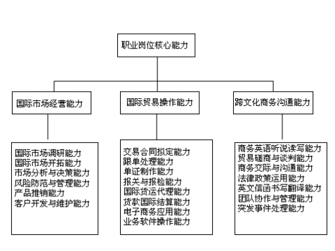 (2)突出了以核心岗位职业能力为依据,按岗位或岗位群的要求为起点的课程设计、教学安排的逆向思维,以职业岗位能力为核心构建课程体系。针对外贸岗位或岗位群的新变化、新特征及其所要求的新知识、新能力和新素质等方面的具体要求和量化标准,构筑本专业核心职业岗位能力模块课程体系。强调课程体系现实性和教学内容的动态性和前瞻性建设。
