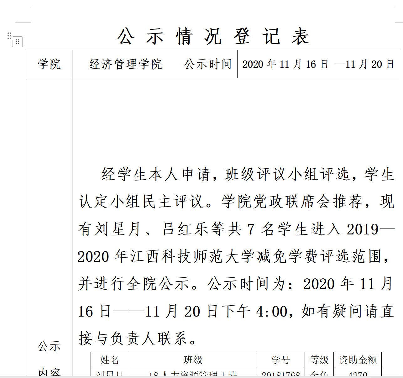 经学生本人申请,班级评议小组评选,学生认定小组民主评议。现有冯兰英、张燕芳、肖杨等488名学生进入2020——2021年江西科技...